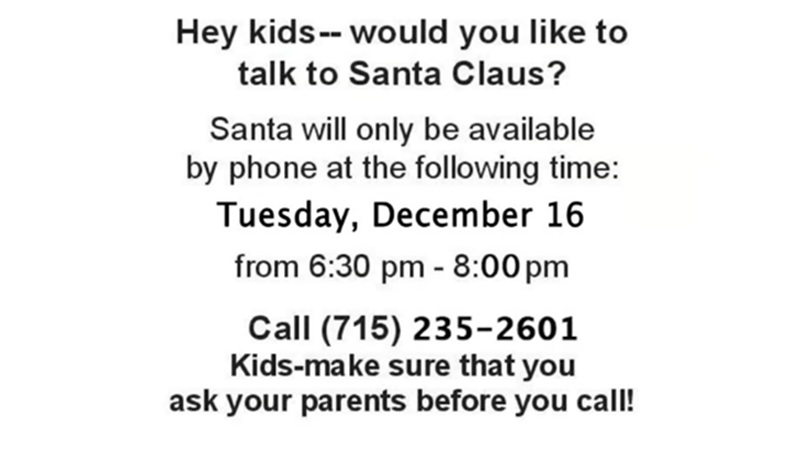 Menomonie Lions Club will have a float in the Winter Daze Parade on Dec 11 with members handing out flyers to parents encouraging them to have their children call in to talk to “Santa” on Dec 16 between 6:30 – 8:00pm. See below.